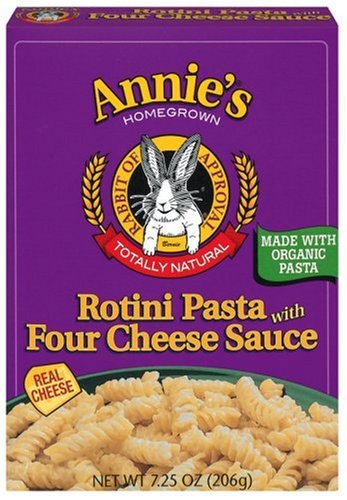 Annie's Rotini with four cheese sauce is made from certified organic Rotini shaped pasta and a delicious, creamy four cheese sauce that is totally natural. Perfect as a side dish or as an entire meal, Rotini with four cheeses compliments any meal and is simple to make in just ten minutes. You can even add tomatoes, zucchini, chicken or any of your favorite ingredients to turn this simple dish into a gourmet meal!Annie's Homegrown Rotini Pasta with Three Cheese Sauce, 7.25-Ounce Boxes (Pack of 6) Specifications