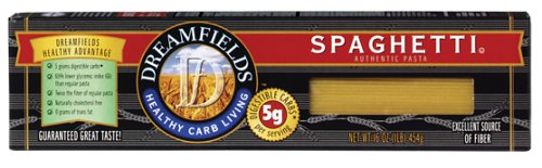 Healthy Spaghetti pasta. Just one bite of Dreamfields pasta with your favorite spaghetti sauce will convince you that pasta is indeed back in your menu. Unlike other healthy pastas, Dreamfields gets very high marks from its customers for incredible taste and texture that's almost like the real thing! A typical 2-oz serving of regular pasta is an astounding 42g carbs, but Dreamfields pasta has only 5g digestible carbs. Astound your friends and family with this "diet" pasta that will have them begging for more. Dreamfields Pasta is the perfect way to eat healthy and manage your diet and family nutrition. Dreamfields has five grams of digestible carbs, is naturally cholesterol free, and saturated fat-free and contains zero grams of trans fat. Dreamfields helps limit by 65% the rise in blood glucose levels that normally occur after eating ordinary pasta. This low glycemic index for Dreamfields Pasta makes it perfect for many people with Diabetes. Kids love the taste of Dreamfields so everyone in your family will love it.Dreamfields Healthy Spaghetti Pasta Feature